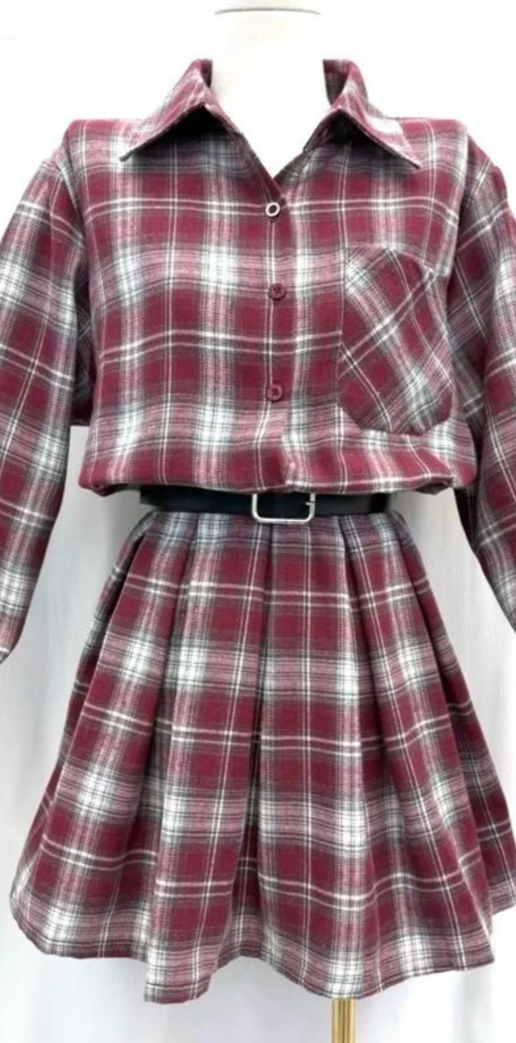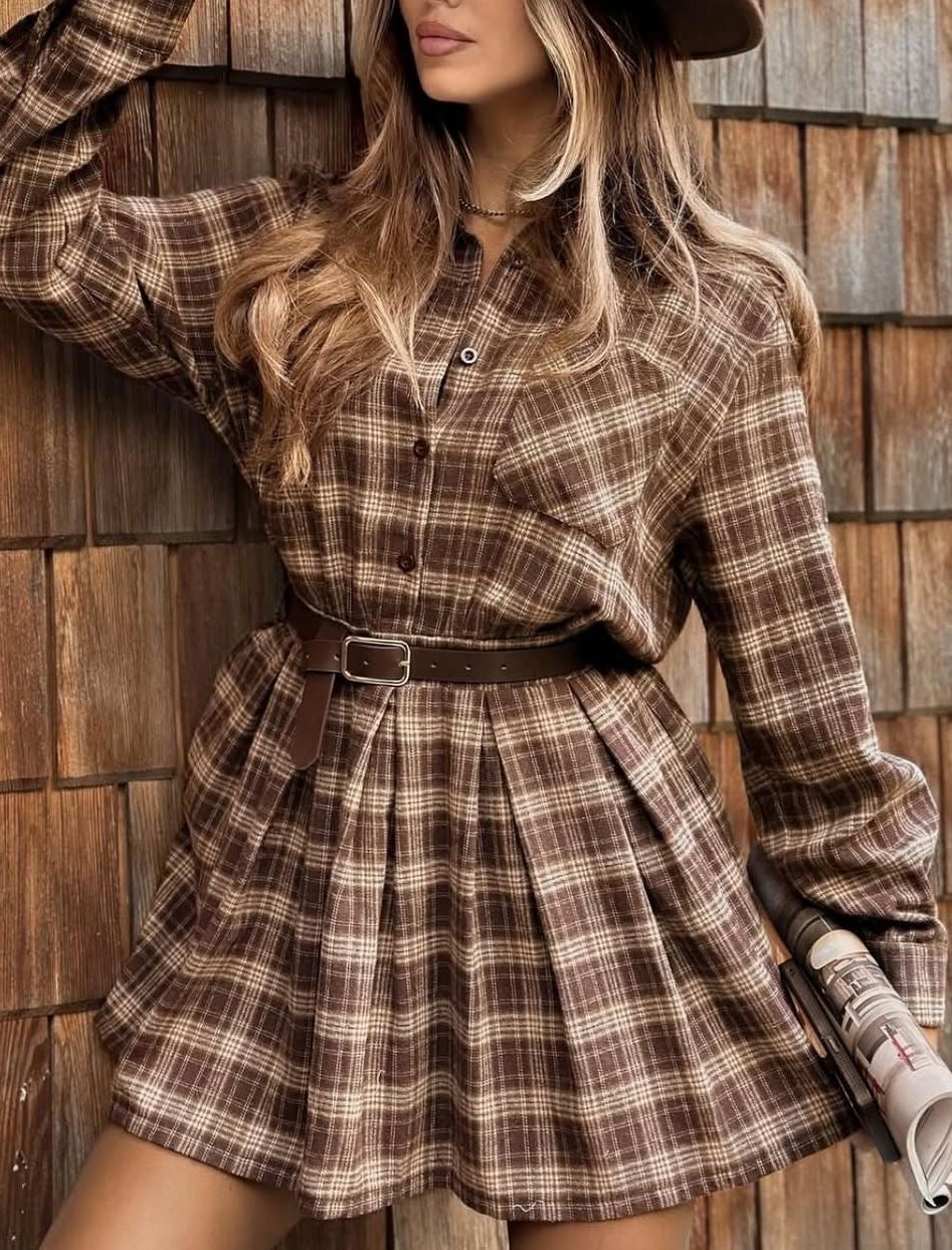 Abito corto in fantasia a quadri con cintura in vita e gonna a pieghe.