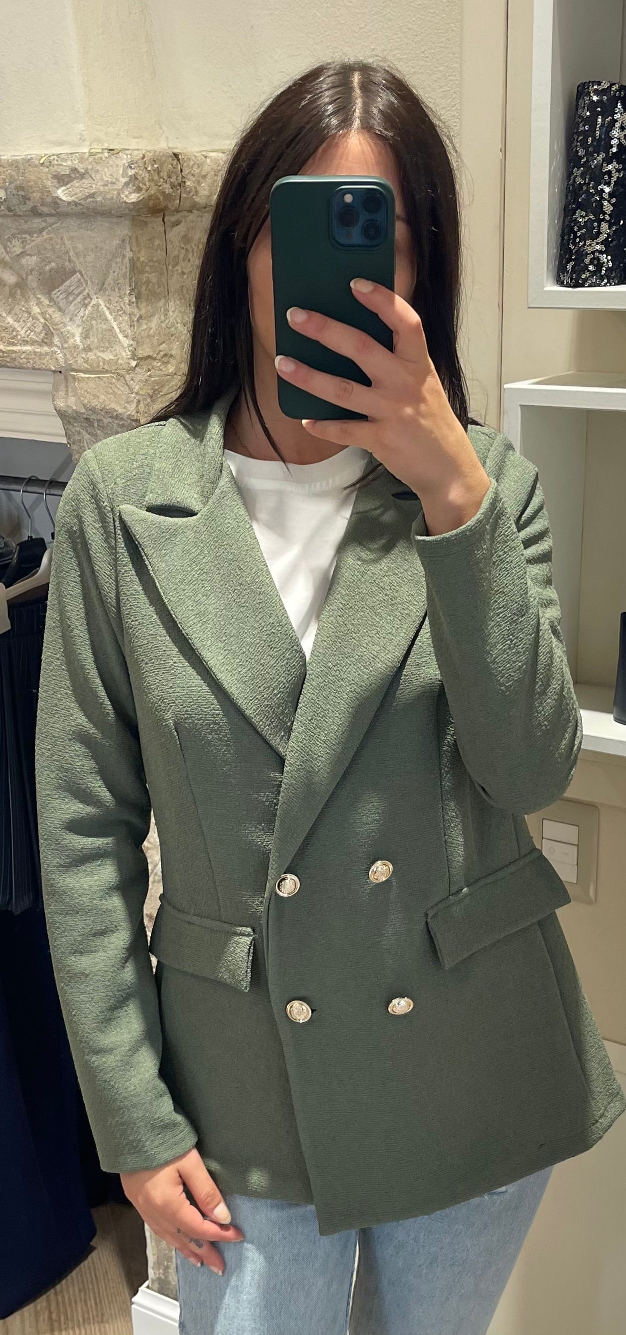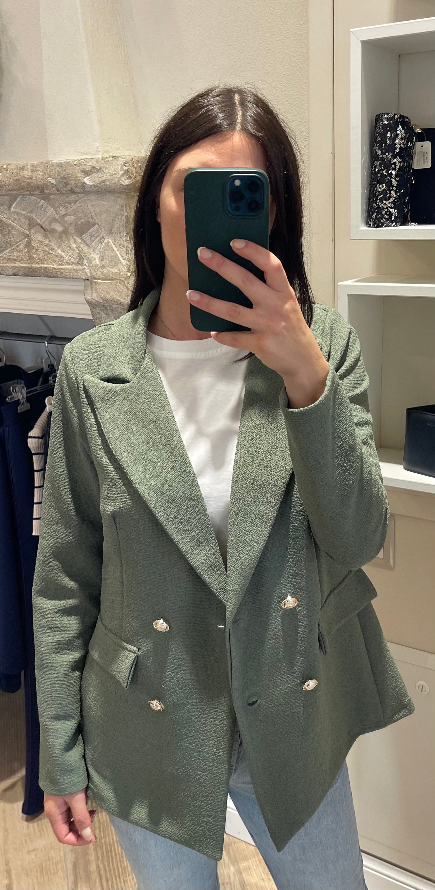 Giacca verde doppiopetto con tasche decorative e bottoni in color argento.