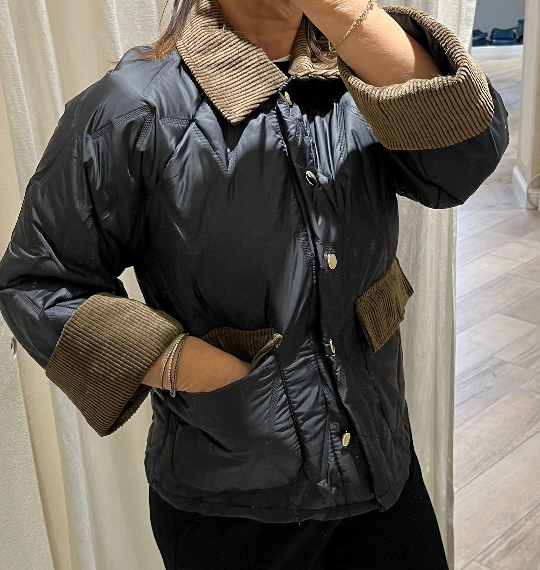 Giubbino trapuntato con collo manica e tasca in velluto a coste.