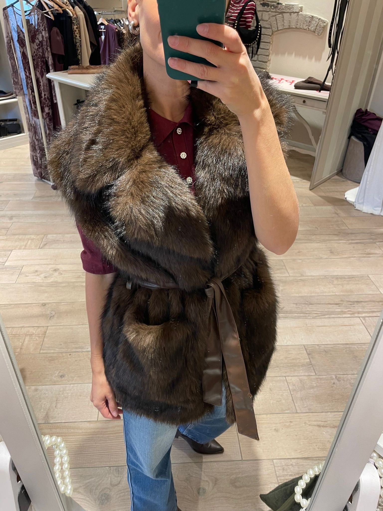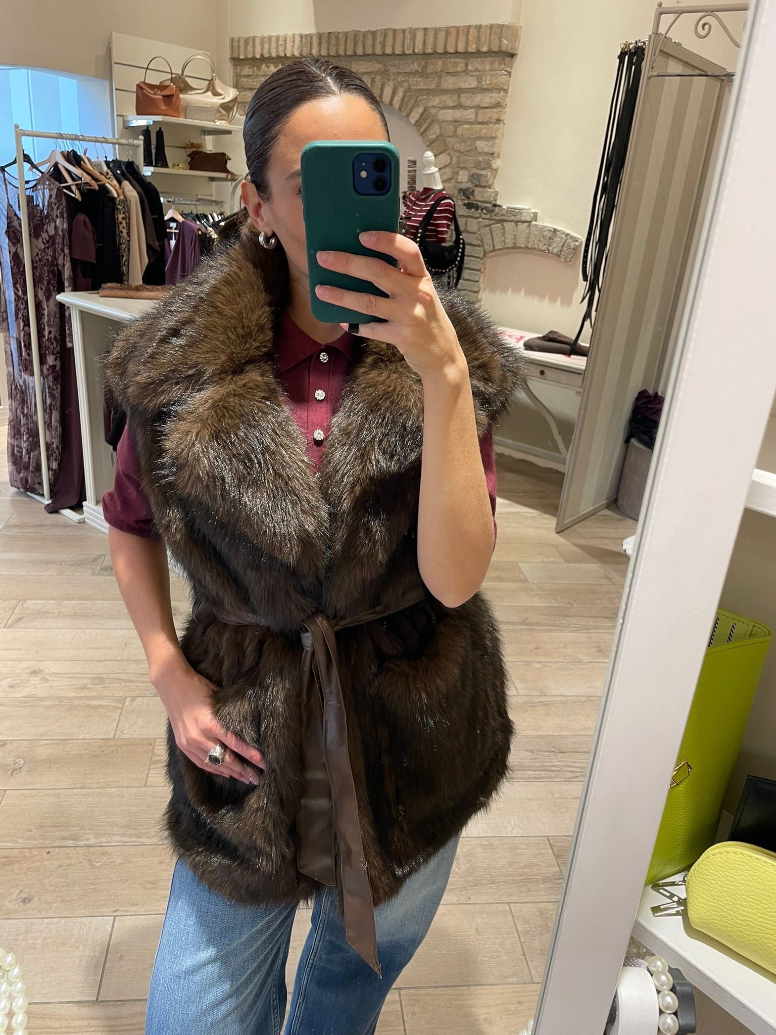 ecopelliccia morbidissima smanicata con cintura in ecopelle e tasche color marrone.